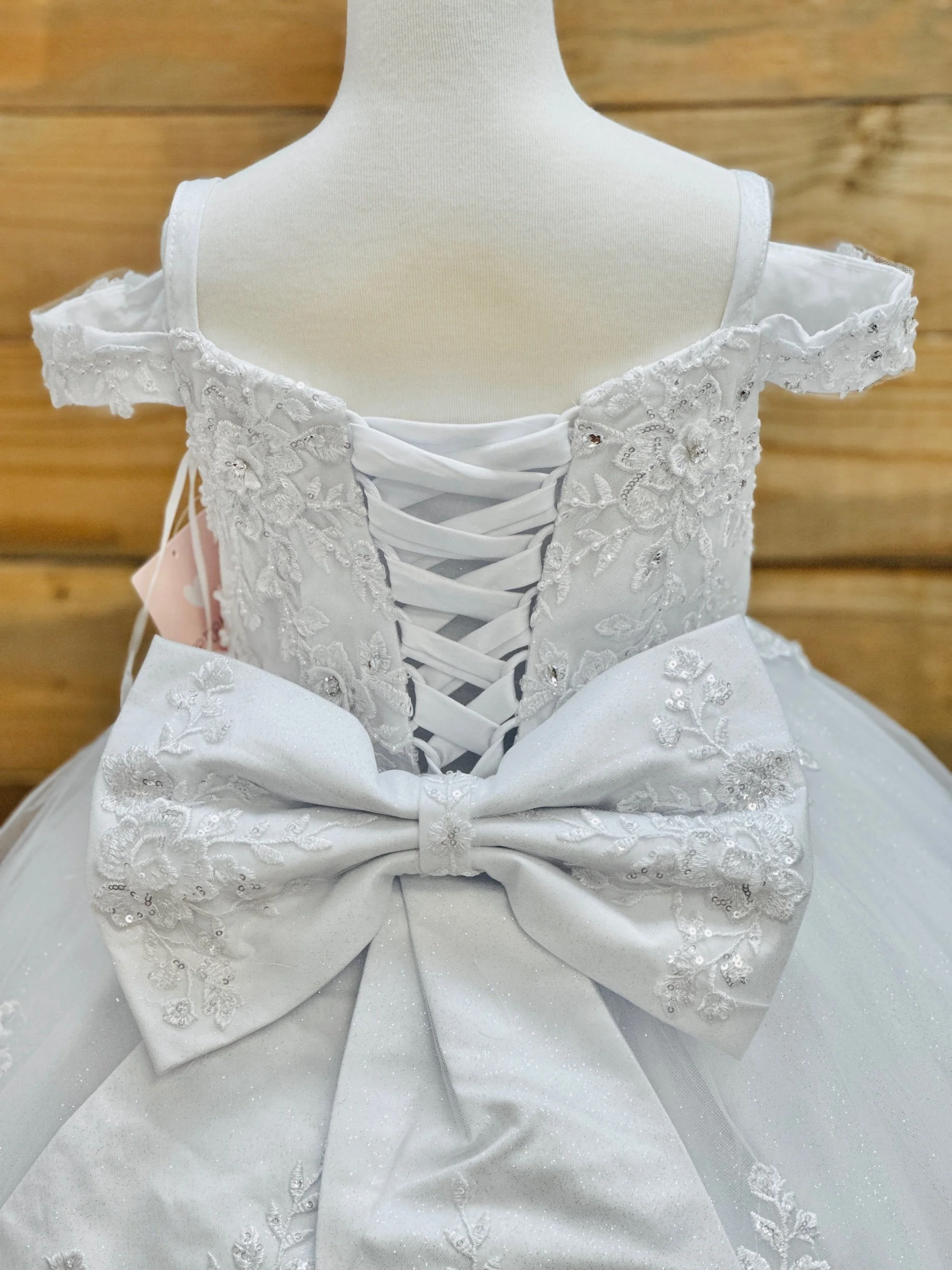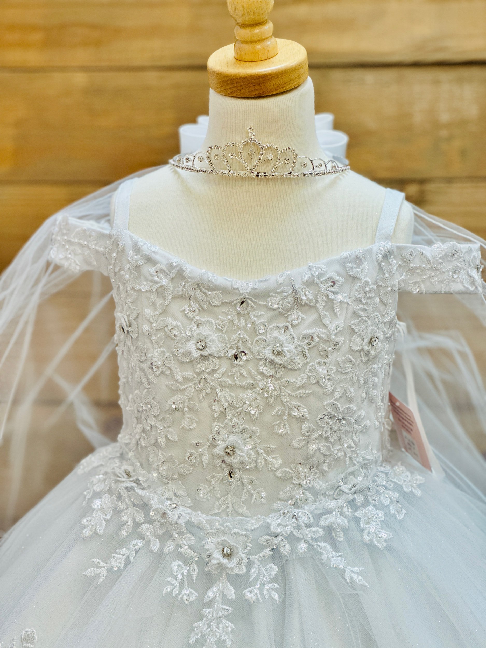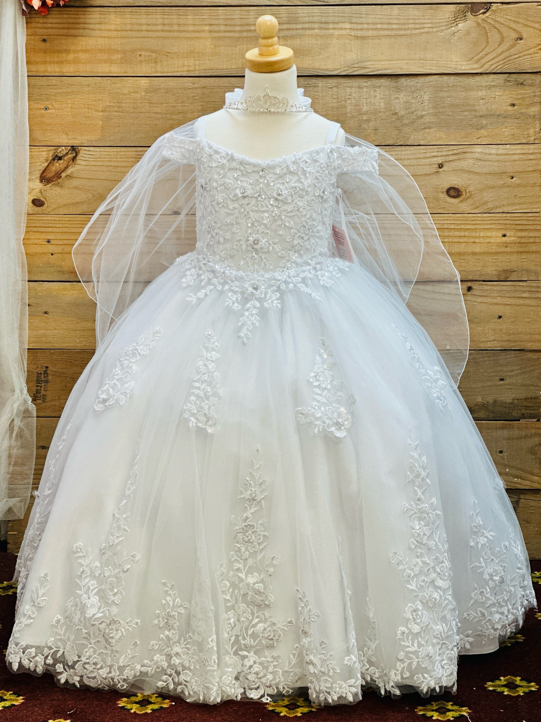 Full length dress, all glitter tulle fabric. Only available in white, does not include crown, veil, or shoes. Petticoat is available on our website for a separate cost.