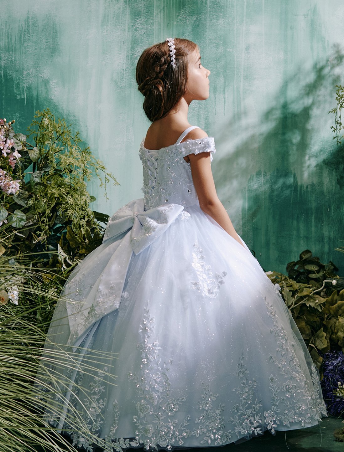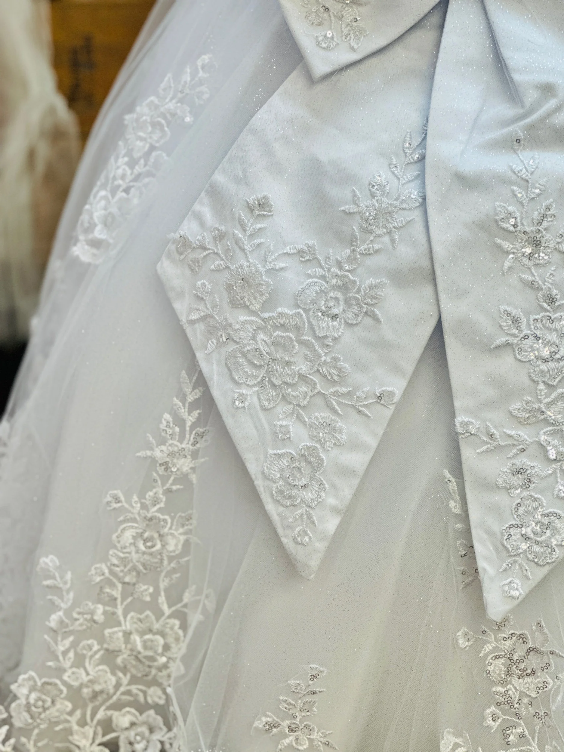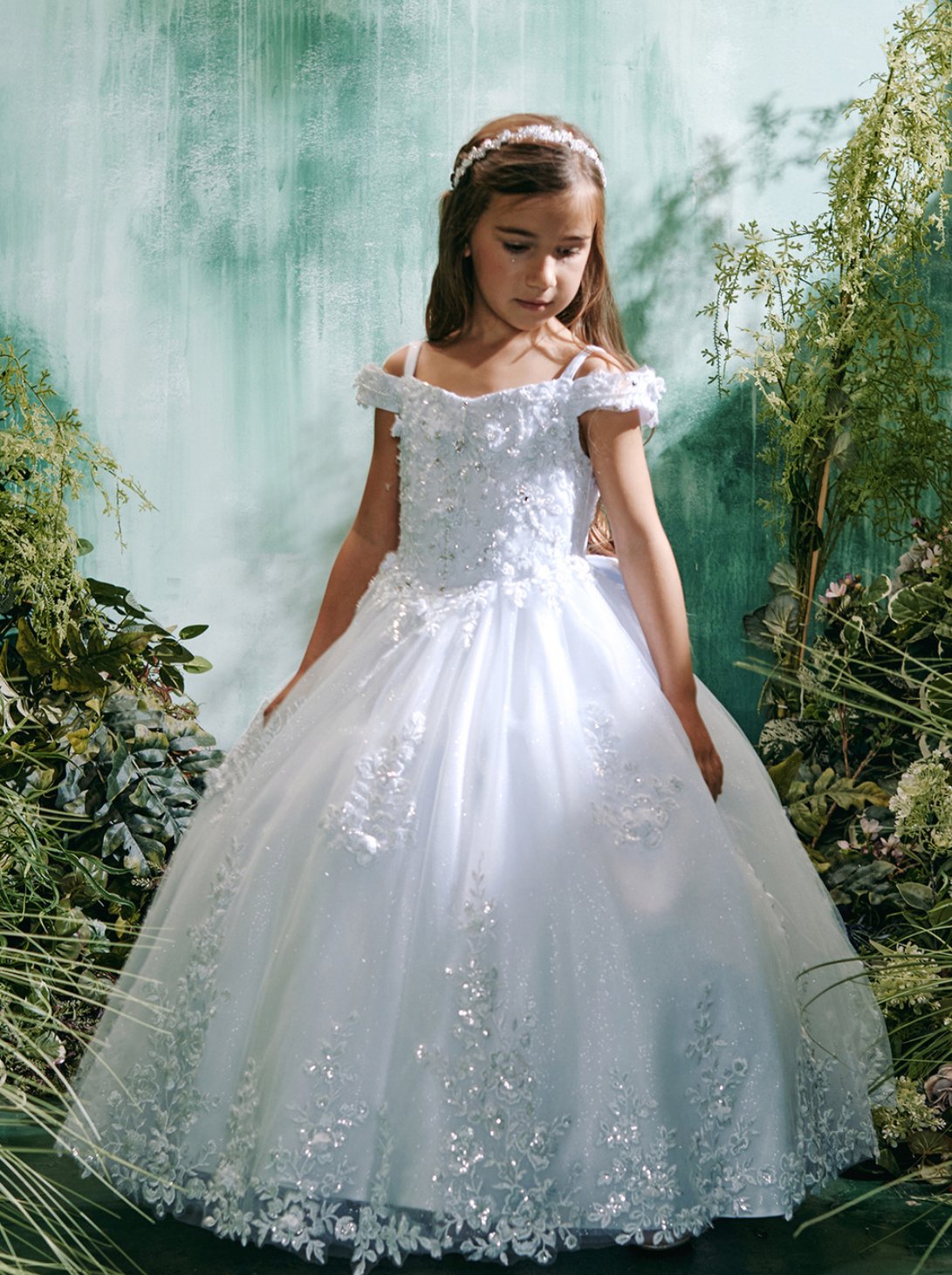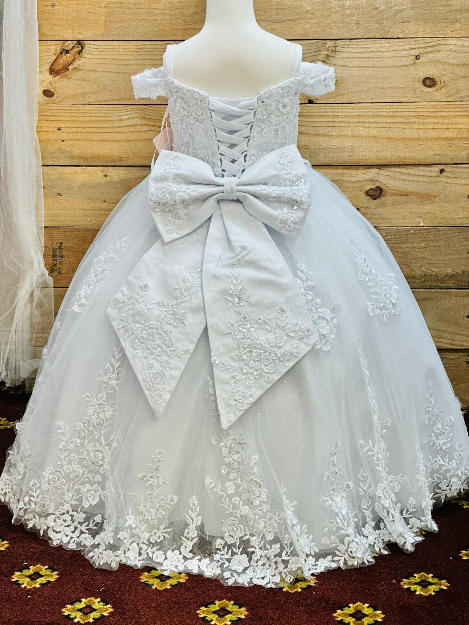 Full length dress, all glitter tulle fabric. Only available in white, does not include crown, veil, or shoes. Petticoat is available on our website for a separate cost.
