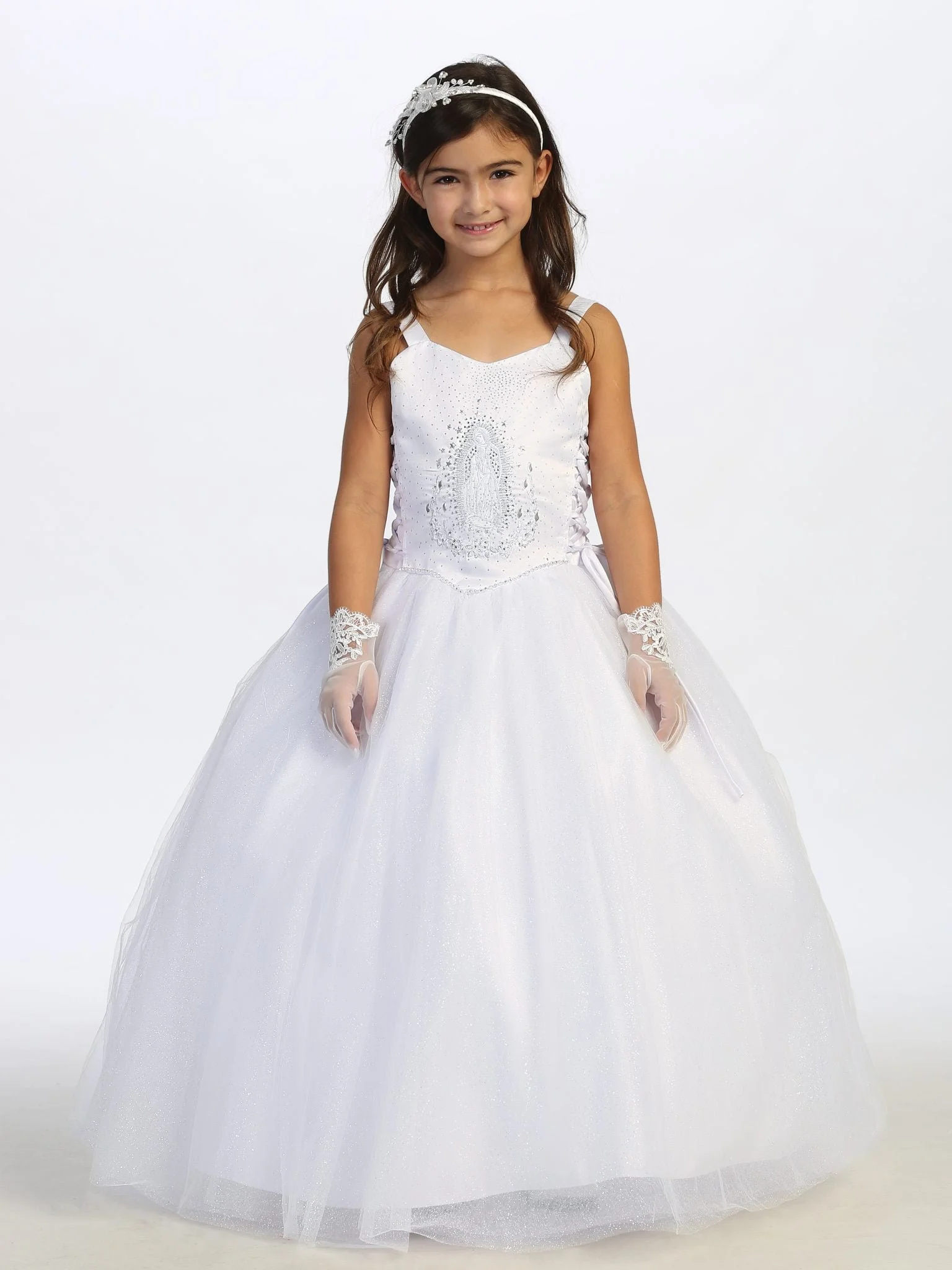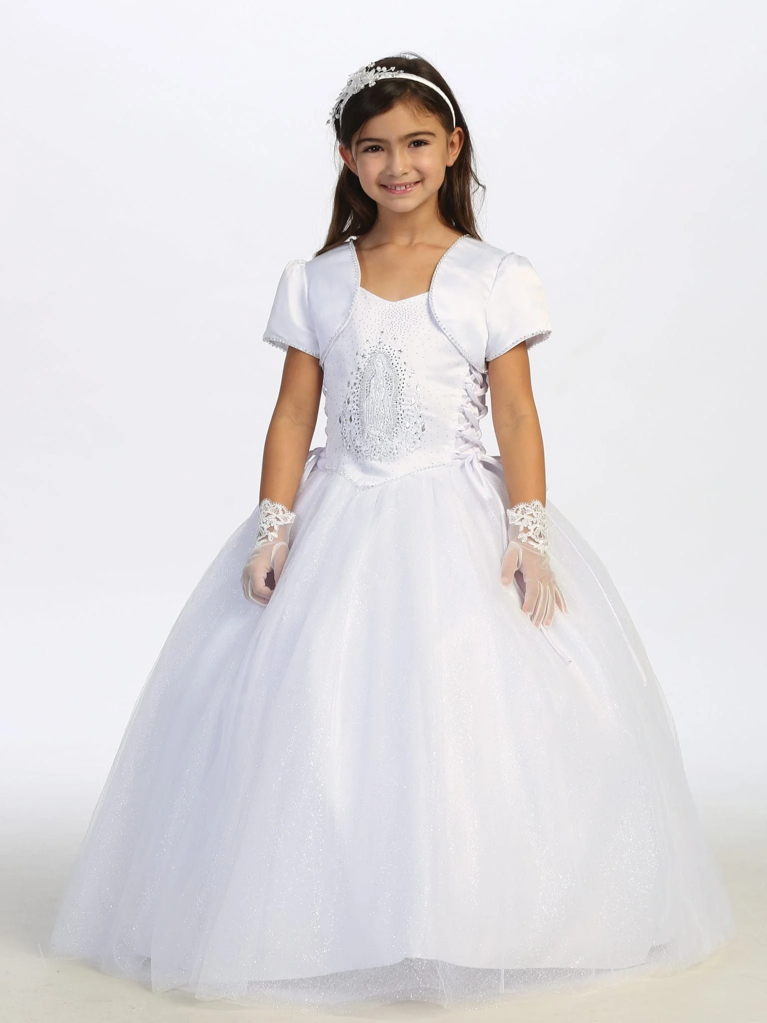 Communion Dress with Maria Embroidered Bodice, Tulle Skirt, Comes with Satin Bolero Jacket. Only in size 20X Please reference to last picture with size chart