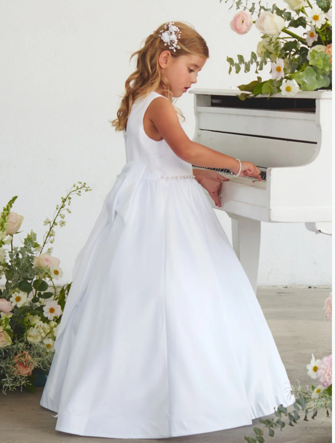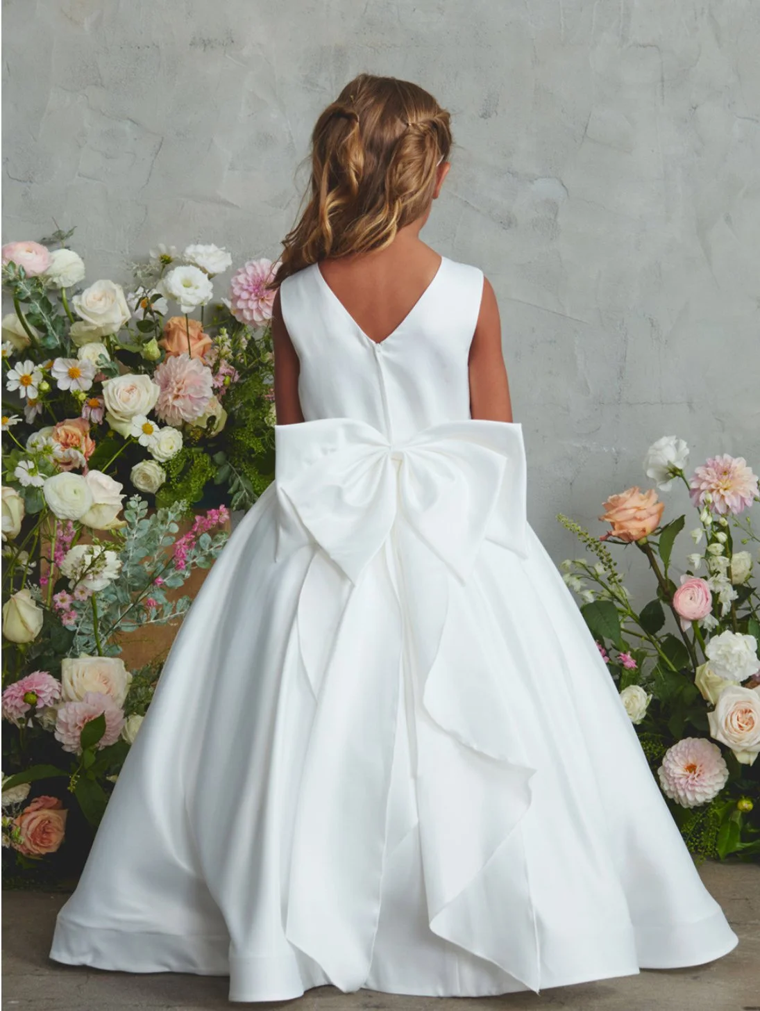 Full satin bodice and skirt with pearl and rhinestone waist, V back with rear center zipper, and a large bow accent on the back. Only available in white. Does not include shoes or headpiece.