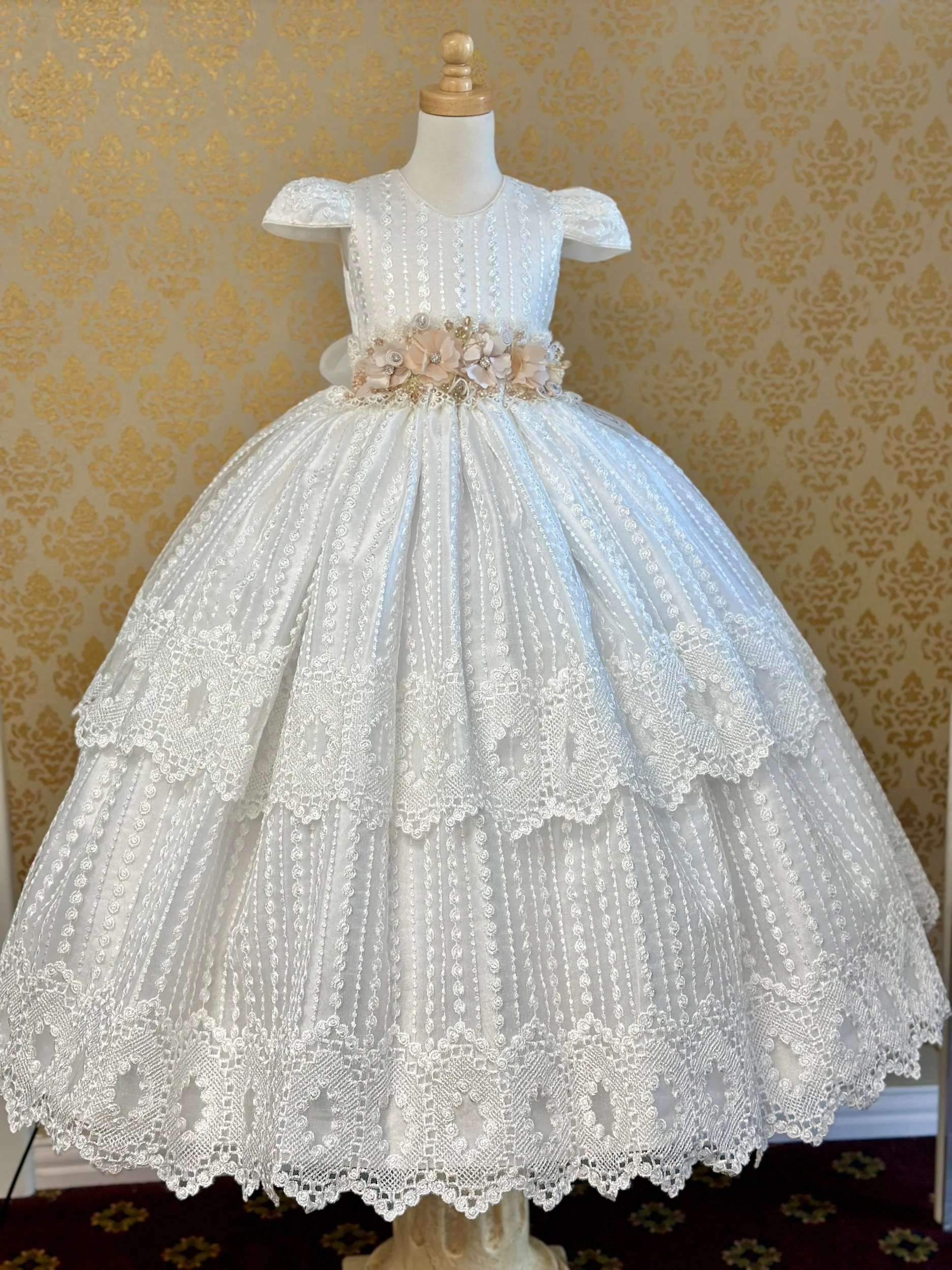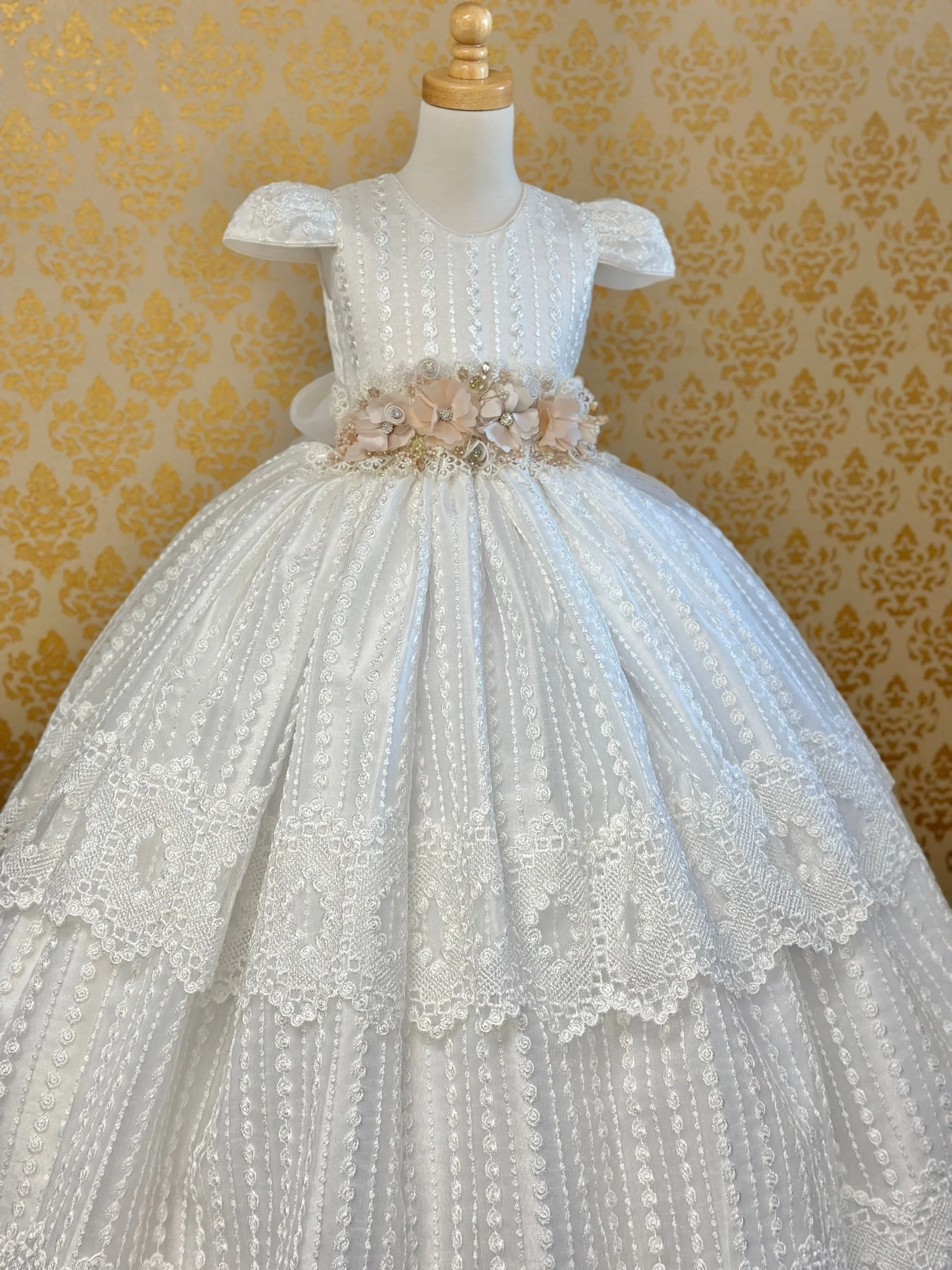 Full length ball gown, first communion dress. Petticoat not included. Belt is removable with brooch pin claps.